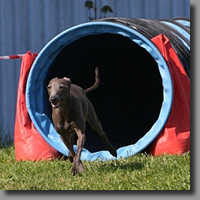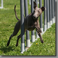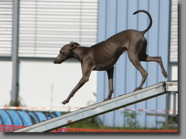 Ein italienisches Windspiel beim AgilityAgility ist ein auf den ersten Blick für Windhunde eher unüblicher Hundesport, jedoch ist das italienische Windspiel prinzipiell sehr gut dafür geeignet, denn durch seine langen Beine, den muskulösen Körperbau und seine Wendigkeit bei insgesamt geringer Größe und Gewicht bringt es körperlich gute Voraussetzungen dafür mit.Die Bilder zeigen "Gambino de Valverde Santo", den Wurfbruder unserer Hündin Grisabella, der in der Schweiz recht erfolgreich bei Agility-Wettbewerben startet. Beim Agility geht es darum, einen Parcours aus mehr oder weniger "standardisierten" Hindernissen, die aber immer wieder unterschiedlich kombiniert werden, in möglichst kurzer Zeit mit möglichst wenig Fehlern zu bewältigen. Slalomstangen, Wippen, Tunnels, etc. müssen überwunden werden.