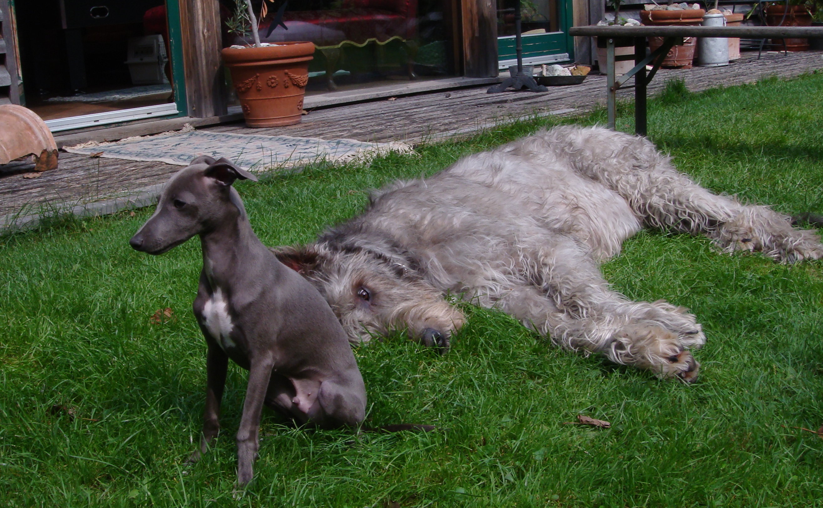 Rosso und Ercolino geniessen den Sommer. Allerdings jeder auf seine Weise, wobei sich inzwischen immer mehr der unterschiedliche Charakter bemerkbar macht. Lino bleibt auch mal eine Weile auf der Terrassenliege bei uns liegen, wogegen Rosso einen sehr großen Bewegungsdrang hat und jede Gelegenheit zum Spielen nutzt: