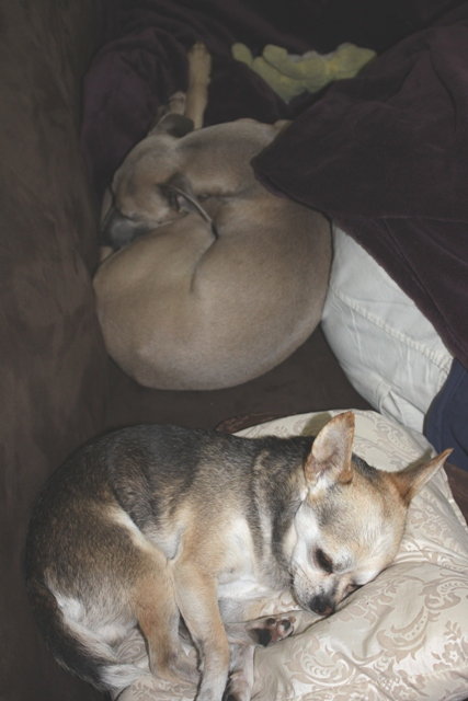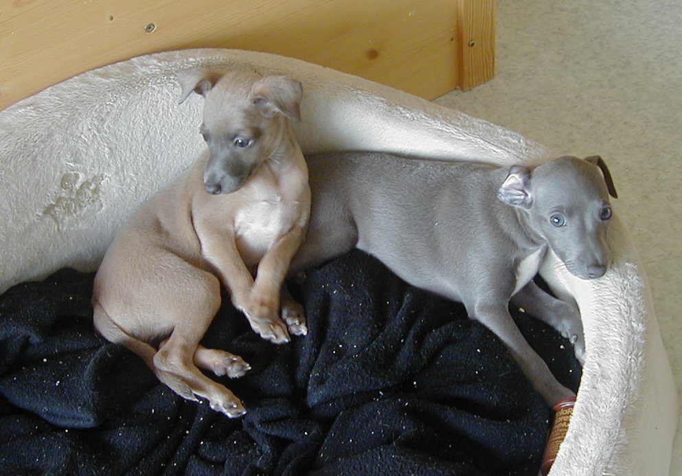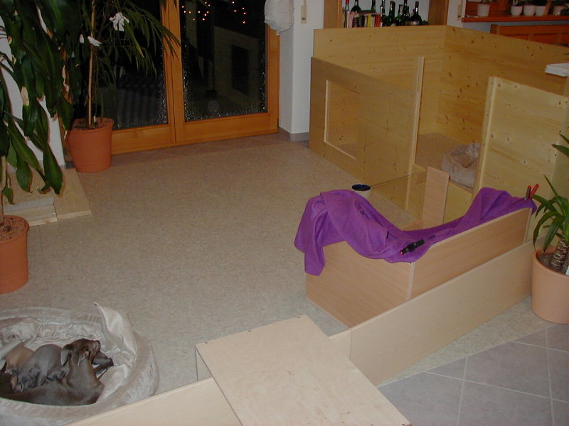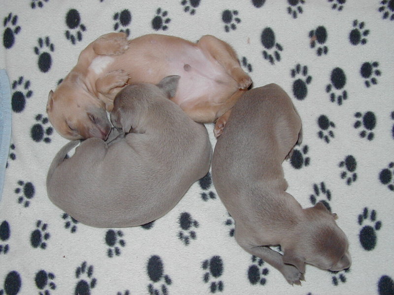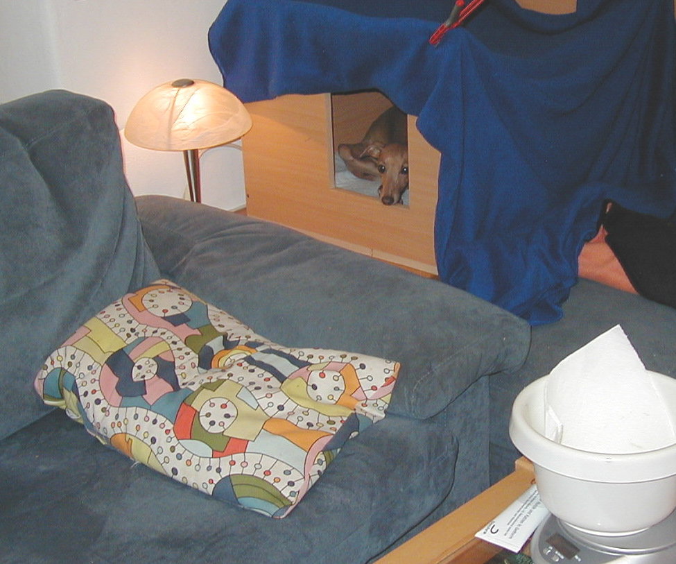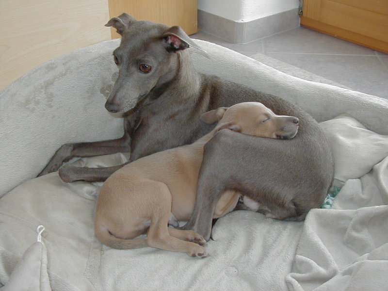 nachts ... vermutlich da, wo Windspiele nun mal am liebsten liegen.... Um Bionda etwas zu entlasten und damit die Gewichtsunter- schiede nicht zu gross werden, füttern wir nun die zwei leichtesten abends auch mit etwas Welpenmilch aus dem Fläschchen.