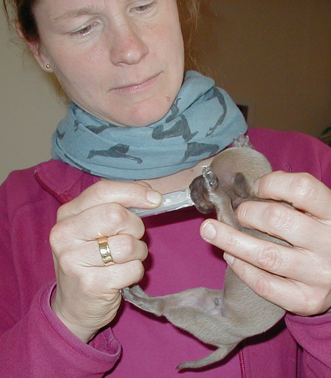 Inzwischen hat sich alles recht gut eingespielt, aber Bionda hat sichtlich zu tun, ihre grosse Kinderschar satt zu bekommen.Der kleinste Rüde kam in dem Gedränge ständig zu kurz und nahm nicht zu. Da Bionda aber nicht zulässt, dass man täglich mehrfach in die Wurfkiste fasst und einen Kleinen zum "zufüttern" herausnimmt, wird er nun von unserer Tierärztin (Dr. Koldt in Traunreut) "von Hand" aufgezogen, bis er feste Nahrung zu sich nehmen kann.