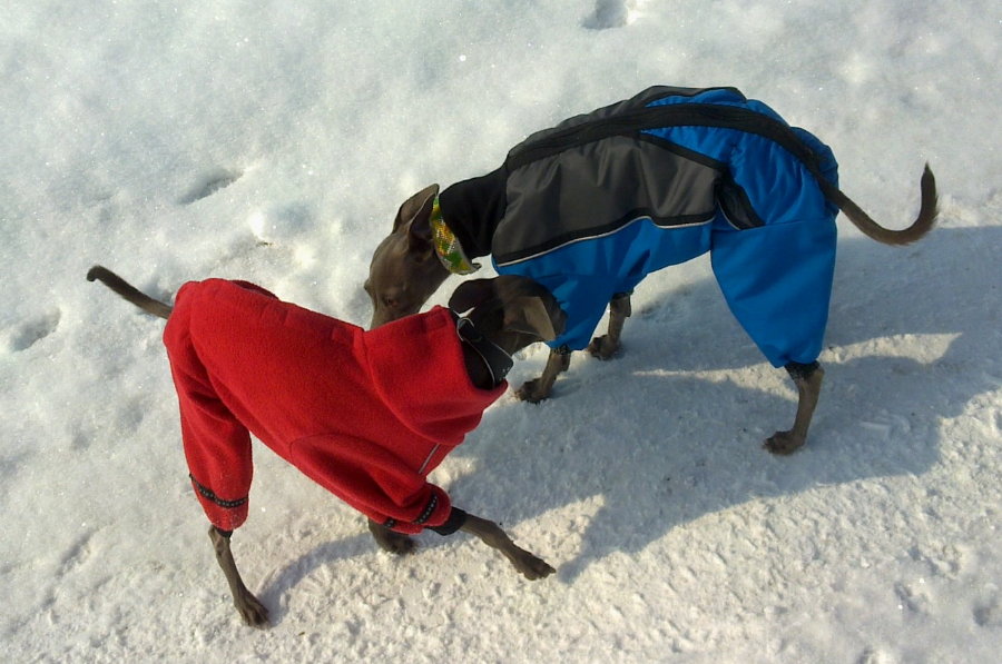 Dieses Jahr hatten wir ein wenig besinnliches Weihnachten. Am Heiligabend nähte ich noch immer an den warmen Welpen-Mäntelchen, die die Welpen heuer auf ihrem Start in ihr weiteres Leben mitbekamen. 6 Welpen mit allem Nötigen für die ersten Wochen auszustatten macht doch auch Arbeit und in meinem Arbeitszimmer sah es zeitweilig aus wie in einem Lager vom Fressnapf.Am 25. Dezember wurden "Dandy" und "Daisy" abgeholt, am 26. Dezember trat "Donna Mosella" die weite Reise nach Cochem an und ich selbst brachte "Daytona" zu ihrer neuen Familie in die Nähe von Zürich. "Diego" blieb bei Mama Bionda zuhause und Däumeling machte Familienurlaub mit seiner Ziehmutter Dr. Lisa Koldt und deren Whippetmädels.