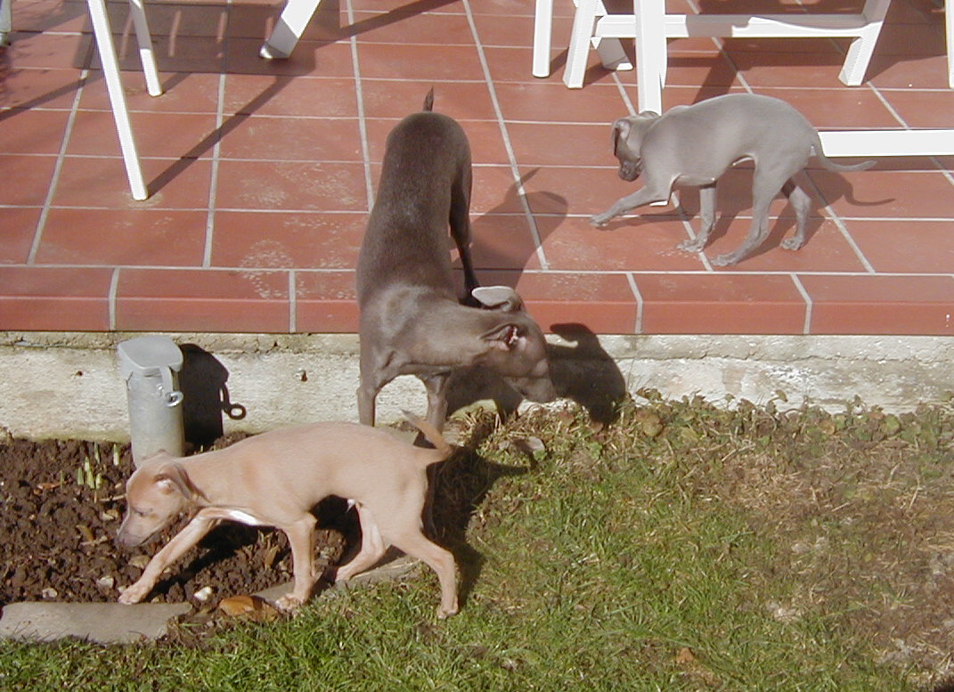 Am 15. kam Casanova (Biondas Vater) für einen dreiwöchigen Besuch zu uns. Seine Besitzerin Peggy macht gerade einen Familienbesuch in den USA und so bot es sich für Casanova an, in dieser Zeit bei uns ebenfalls einen "Familienurlaub" zu machen.Bionda hat nicht nur den schönen Kopf von Casanova geerbt, sondern ist ihm auch im Charakter sehr ähnlich. Casi ist stets gut gelaunt und sehr verschmust und war auf den täglichen Spaziergängen in der Stadt ein sehr angenehmer Begleiter. Die drei genossen sichtlich die Wärme im kleinen Hunde-Wintergärtchen (aus UV-durchlässigen Spezialplatten!), den wir letzten Herbst für die sonnigen aber kühleren Tage auf die Terrasse gebaut hatten. Foto: Grisabella (Biondas 10jährige Mama, links), Bionda (mitte), Casanova (9 Jahre, rechts).