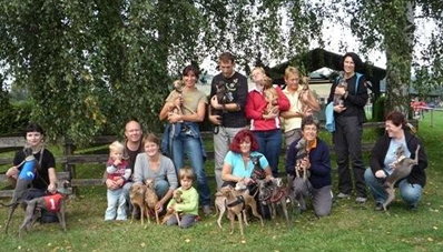 im Mai und Juni besuchten wir mit Grisabella einige Ausstellungen. Da sie immer noch topfit und sehr schön ist, wird sie gelegentlich in der Veteranenklasse ausgestellt. Da wir momentan keinen eigenen aktiven Rennhund haben (Grisabella hat mit 9 Jahren keine Rennlizenz mehr!) fuhren wir mit "Adorno" Anfang September zur Renn-Europameisterschaft nach Hünstetten. Gerald hatte zu dem Zeitpunkt keine Zeit und wir nützten die Gelegenheit um für "Bionda" auf Bräutigamssuche zu gehen, denn der Vater ihrer Welpen (Früjahr 2016!) soll neben Schönheit vor allem auch gutes Renn- bzw. Coursingtalent haben.